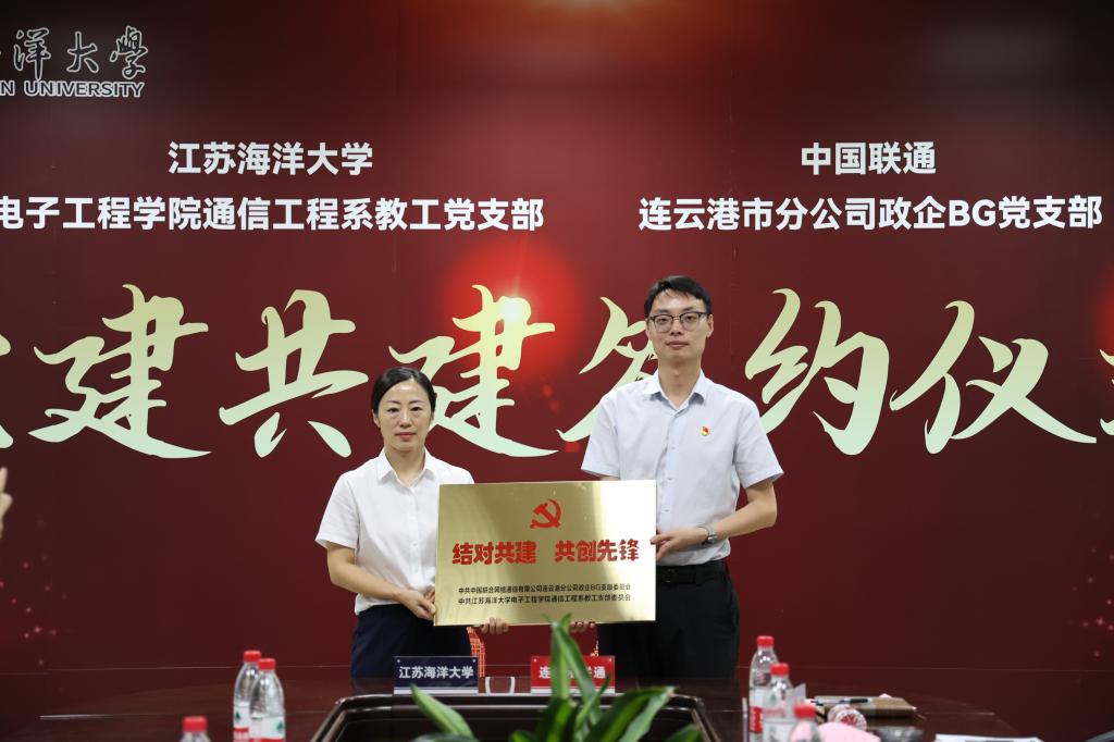 两个共建党支部全体党员在支部书记带领下,参观了中国联通有限公司连云港市分公司的通信大数据中心和党建长廊,并举行了交流座谈。座谈会上,双方就人才培养和校企合作、促进党群工作交流、开展支部共建活动的目标与详细内容等方面展开讨论,一致同意要以此次活动为契机,以“党建引领、人才培养、产教融合互推”为抓手,积极探索在新时代背景下党建工作新思路、新模式,以“党员活动日”、“企业党员志愿讲座服务”、“校企党员共上党课”、人才培养方案交流讨论等活动为载体,充分发挥共建双方在本职工作及改革发展中的“内生动力”,实现优势互补、相互促进,实现党的建设与校企发展良性互动,加速推进“党建”和“育人”的深度融合。在热烈友好的氛围中,校企双方党支部代表签署了共建协议,并进行了授牌仪式。