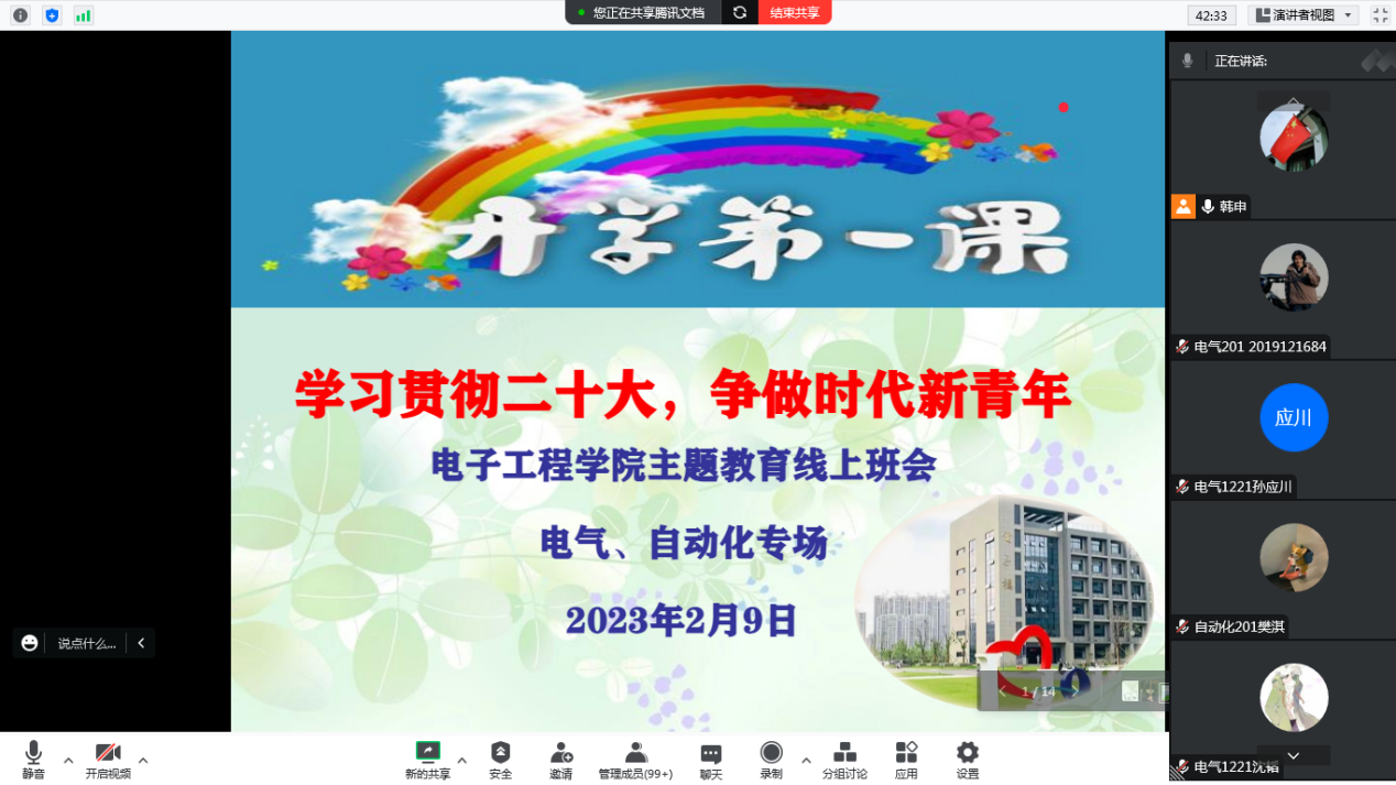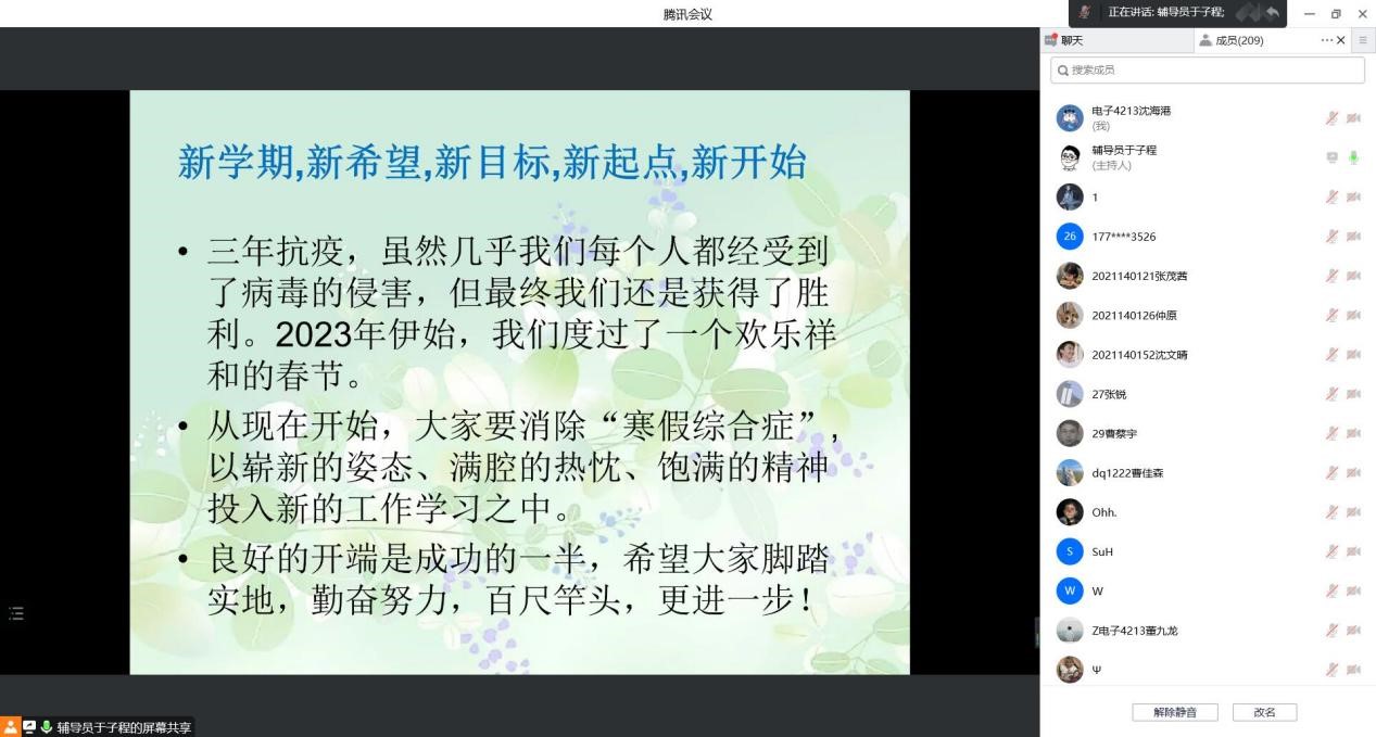 律回春晖渐,万象始更新。开学在即,为使广老员工继续勇敢无畏地迎接新学期,并从思想上和行动上进一步完成由轻松假期到开学考试的转换,2023年开学前一周,bv1946伟德官网全体辅导员按专业召开了春季学期主题为“学习贯彻二十大,争做时代新青年”的“开学第一课”集中教育活动。