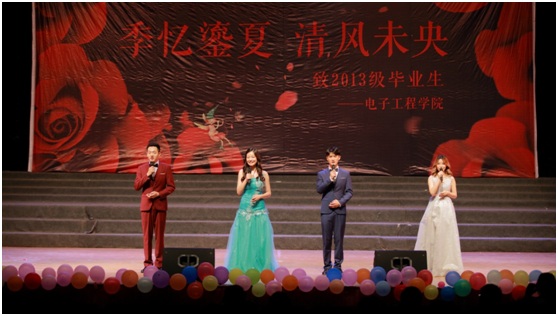 ME街舞社动感炫酷的开场舞拉开了整场晚会的序幕,电子院独具特色的荧光舞表演瞬间点燃全场。高俊逸,李圣文等人带来《独家记忆》、《小幸运》、《成全》、《凉凉》、《茶底世界》歌曲串烧,赢得了在场观众热烈的掌声。台上台下热情高涨,一同高歌,互相为未来打气。青春不散,哪怕时光脚步太匆匆。歌声嘹亮,哪怕泪水盈眶打湿了笑容。电子辩论队为毕业晚会带来了饱含深情的诗朗诵《我们一起走过淮海园》,伴随着轻柔的音乐,让毕业生们回忆起了在淮海园一起走过的美好时光,他们发自内心的情感表达赢得了师生们的连连赞赏,将晚会推向了一个小高潮。阳光手语社的手语表演《化身孤岛的鲸》和着优美的音乐,整齐划一的手语动作引起了全场观众的共鸣。淳乐团带来《红日》加《老男孩》的乐队演奏,他们将这两首歌曲完美的结合,鼓励大家不要放弃自己的青春和梦想,不畏艰难,勇往直前,终会到达胜利的彼岸。bv1946伟德官网郑宏婕老师主唱,商公司张师瑜同学钢琴伴奏给大家带来了一首深情的《乡恋》,引爆了晚会的另一高潮,这种不同于平时教学的互动将成为毕业生们日后最特别的记忆。被誉为“发福利”的互动环节,给观众带来了更多的欢乐。而陈开的吉他弹唱《天空之城》、《斑马斑马》蕴含一丝忧郁的忧伤,所以显得格外动听。电子院员工会文艺部给我们带来了小品《老同学》,台词幽默风趣,全场笑声与掌声不断。女舞《EXERCISE ME》曼妙的舞姿展现了电子女生的魅力,给我们带来了一场精彩的视觉盛宴。毕业学长王启航和郭子阳的男生合唱《黑暗骑士》唱响了对大学四年的追忆和对未来的希冀。最后晚会以毕业代表讲话作结,毕业生们深情地倾诉着对母校和公司的眷恋不舍之情。