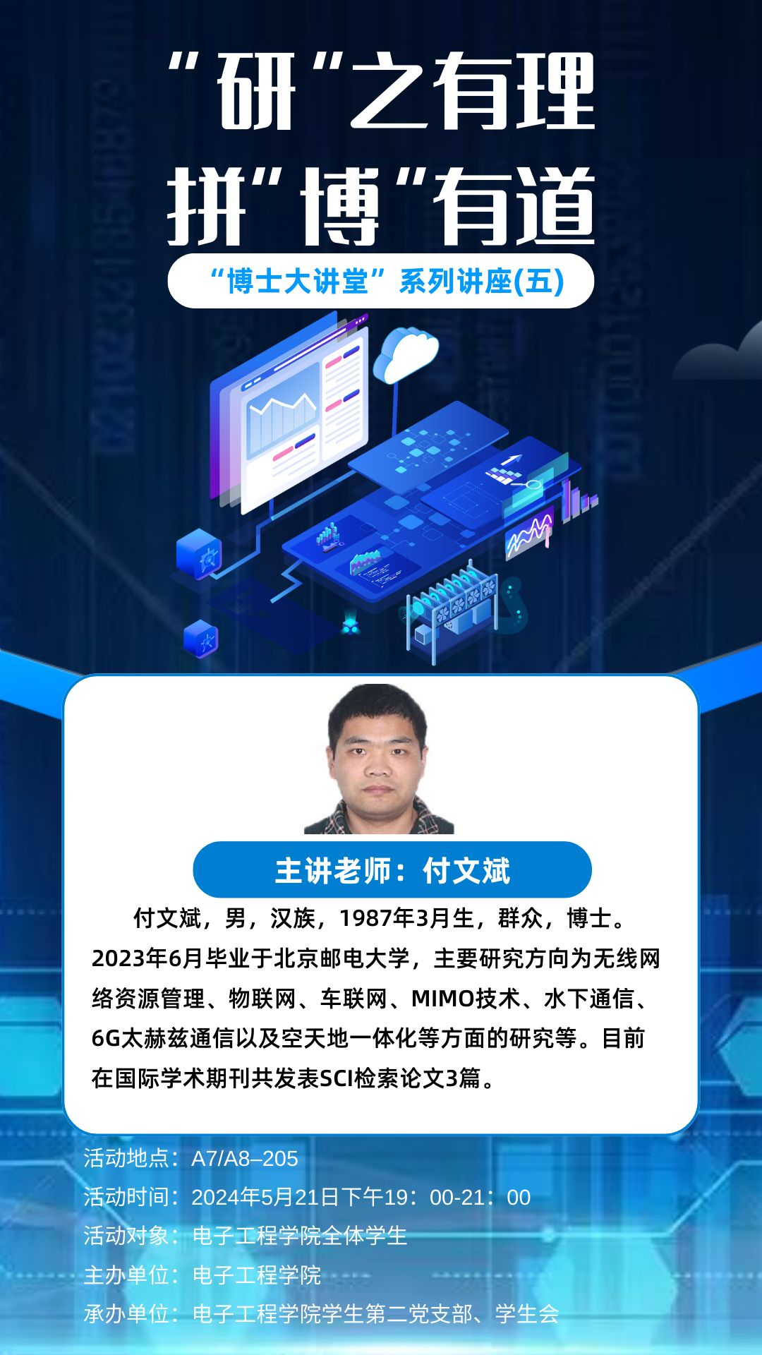 5月21日下午,bv1946伟德官网在A7/A8-205社区会议室举办了第五期“博士大讲堂”活动,该活动由院员工第二党支部和员工会承办。本期讲座的主题是“有梦想就要去追,万一实现了呢!”,由通信系的付文斌博士主讲,吸引了近60名师生参与交流学习。付老师以自己的求学经历和所面临的困惑开场,通过分析社会现象和举例草根逆袭的故事,如济宁医公司员工2022年考研逆袭和郭有才的网络走红等,强调了树立人生理想的重要性以及通过不懈努力实现人生目标的可能性。