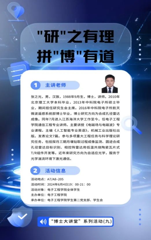 6月4日下午,由bv1946伟德官网主办,院员工第二党支部、员工会承办的第九期“博士大讲堂”活动在A7/A8-205社区会议室成功举办。通信系的张之光博士以“‘研’之有理・拼‘博’有道”为主题开讲,近30名师生到场交流学习。