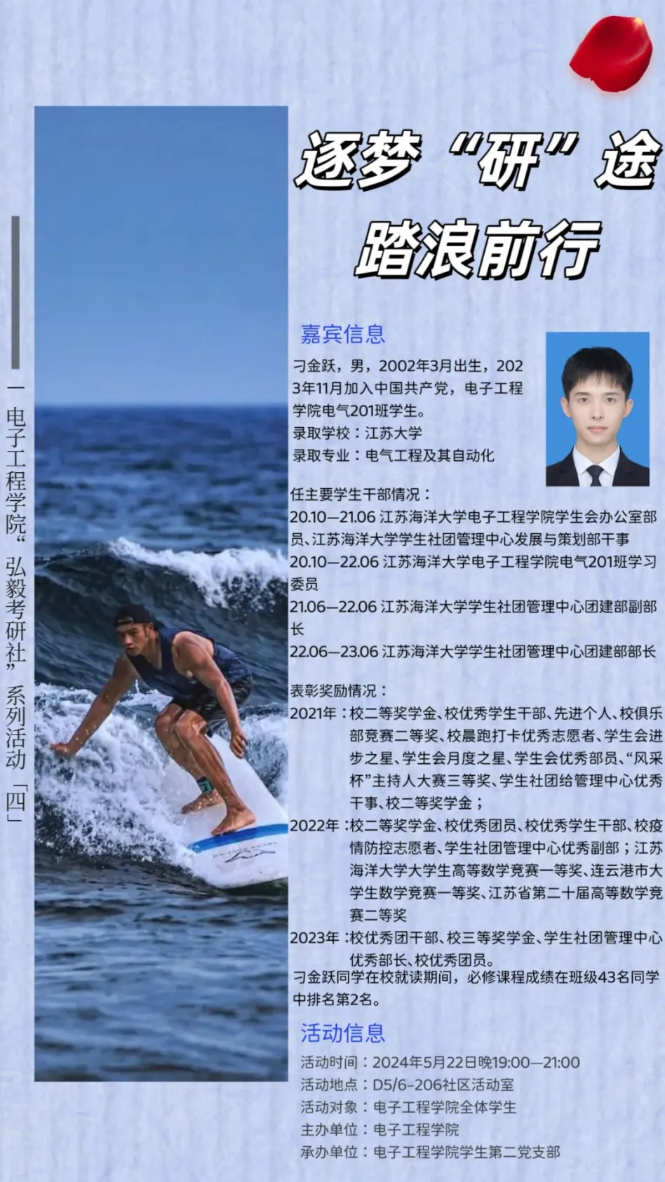 踏浪前行风正劲,不负韶华争朝夕。为助力考研学子明确考研目标,科学制定考研计划,深入掌握考研技巧, 5月22日晚上,由bv1946伟德官网主办、bv1946伟德官网员工第二党支部承办的“弘毅考研社”系列活动第三期在D5/D6-206社区活动室举办。本次活动邀请了考取江苏大学的刁金跃同学进行考研经验分享,近30位同学参加了交流会。
