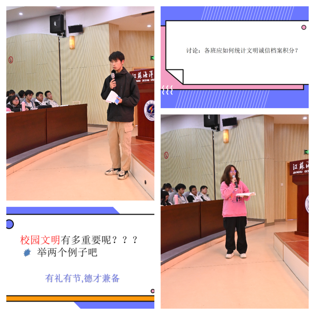 会上针对“老员工校园文明行为规范”“班级文明诚信记录管理”进行了热烈的互动交流。